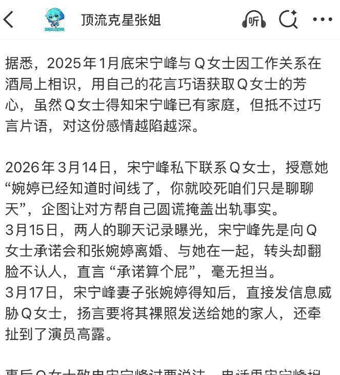 宋宁峰没告诉Q女士我方结了婚。他拿悦耳话和钱哄着Q女士跟他好,还理财会跟张婉婷分开,然后娶Q女士。这种关系搞了一年多。宋宁峰干得更出格,他带着我方犬子去见Q女士,孩子就在傍边,他们作念了不该作念的事。一个当爹的这样干,孩子看着呢,这算哪门子父亲。事情漏了之后,宋宁峰立时找Q女士串供。他让Q女士咬定两东说念主仅仅普通聊天,念念把他出轨的事盖曩昔。有段灌音里,宋宁峰的话能气死东说念主。他反过来问Q女士,你搞坏我的家庭,不该赔点钱吗。他我方先在外面诈欺,倒有脸叫别东说念主赔偿。聊天纪录也在那儿摆着。他前脚还对天发誓,说详情离,后脚就改口说原意算个屁。这东说念主两张脸,嘴上抹蜜,心里拨算盘,跟他在《相遇爱东说念主2》里演的阿谁受气好老公根本不是一趟事。张婉婷的反应也怪。我方老公出轨,一般东说念主火气都冲着老公去。张婉婷不,她把通盘火都发到了Q女士头上。