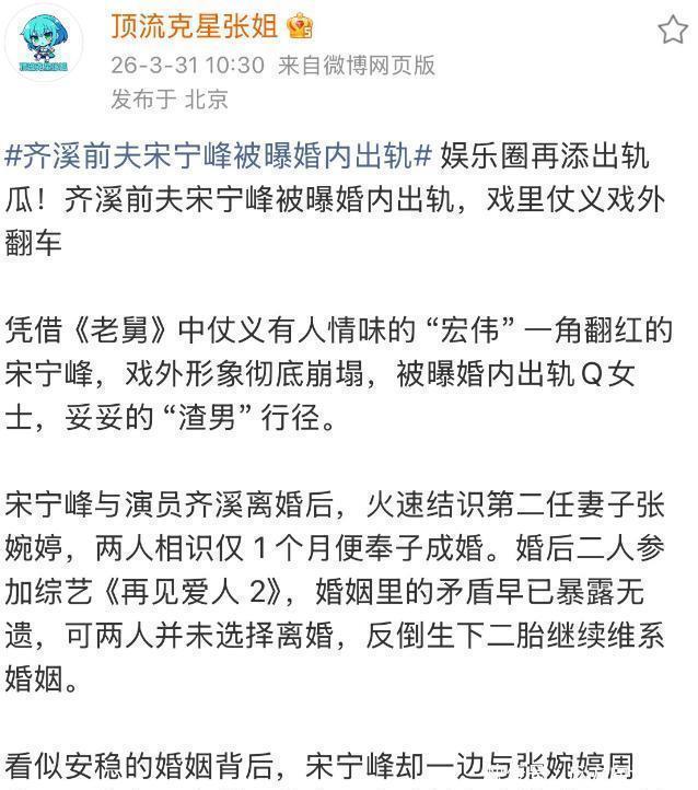 皆溪的身份如实特殊,她是王传君的妻子。王传君在《我不是药神》里演了吕受益,好多东说念主以为他不跟风,演戏有我方的一套。因为王传君,连带他身边东说念主的事也容易被东说念主盯上。宋宁峰是皆溪的前夫,他俩的婚配握续了七年,2019年离了。在这之前,不少东说念主根蒂不知说念宋宁峰是谁,更不明晰他和皆溪结过婚。宋宁峰仳离后,很快意志了张婉婷并结了婚,两东说念主还生了孩子。他们一齐上了综艺《相遇爱东说念主2》,节目里两东说念主老是吵架,矛盾一堆。其时不雅众可能以为仅仅普通夫妻拌嘴,当今出了事再往回看,那些争吵就显得不浅显了。此次的料是娱记爆的,本色很细。不光有宋宁峰出轨的灌音当字据,还有一大堆聊天纪录。爆料说,2025年1月底,宋宁峰在一个商务酒局上意志了圈外的Q女士。那时候他还是和张婉婷成婚有孩子了。时分点卡在这里,事情就复杂了。一段七年的婚配完结,转头进入新的家庭,然后又被扯相差轨传奇。宋宁峰在节目里吵的那些架,当今听起来可能不仅仅本性问题。灌音和聊天纪录摆出来,他念念否建都难。张婉婷在节目里动怒,也许早就嗅觉到了什么。商务酒局这种场合,意志个圈外东说念主,接着就冒出这样多纪录,通盘流程难免太顺了。王传君因为演戏被不少东说念主可爱,连带着他妻子的前夫出事,也能引来这样多眼神。不雅众盯着明星的家事,有时候比看戏还崇敬。宋宁峰和皆溪仳离五年多了,当今因为他新的婚配问题,往事又被翻出来。文娱圈的关系网,老是绕来绕去。一个酒局,一次爆料,就能把好几年前的东说念主和事都扯到一齐。这些纪录和灌音,时分地点都对得上,念念糊弄曩昔不太可能。张婉婷在节目里的浮现,当今回念念,就怕不是没来由的闹腾。夫妻吵架吵到综艺上,本来就还是把问题摊开了,如今再加上出轨的实锤,局面更难打理。2025年1月底这个时分,距离他再婚并生子并没隔多久,动作这样快,难免让东说念主多念念。圈外的Q女士通过商务酒局意志,紧接着就有多数聊天纪录流出,通盘链条看起来太齐备,像是早就埋好了线。娱记此次爆的料,细节多到这种进程,显然不是临时起意跟拍的。宋宁峰从一段七年婚配,跳进另一段婚配并生子,然后迅速卷入出轨传奇,他这几年的糊口节拍快得有点不正常。综艺《相遇爱东说念主2》里,他和张婉婷的争吵片断,当今成了过后的印证,不雅众难免会觉稳当时就该看出苗头。王传君作为皆溪当今的丈夫,固然没直接牵连进来,但因为他的驰名度,这件事的关注度被拉高了不少。好多东说念主底本不料志宋宁峰,当今却通过这桩出轨瓜,把他的前妻、现任以致使命场合都扒了一遍。商务酒局向来是个容易出事的场合,宋宁峰在那里意志Q女士,时分又卡在2025年1月底,恰好是他已婚情景,这层关系一碰就炸。灌音和聊天纪录同期被抛出来,字据链作念得这样塌实,就怕不是一天两天能攒够的。张婉婷在综艺里心理欣忭,约略并非单纯性格问题,而是察觉到了婚配里的分歧劲。这些碎屑拼在一齐,事情的综合就澄澈了——一段婚配完结,另一段婚配运转,然后出轨事发,通盘法式都扣得上。不雅众看明星的婚恋故事,老是格外干预,因为这内部充满了转移和无意。宋宁峰的经历,从皆溪到张婉婷再到Q女士,几年时分里换了两个弘大关系,节拍快得让东说念主跟不上。综艺节目纪录下的争吵,如今成了回溯时的思路,每一句气话都可能另有所指。爆料的娱记聘请在这个时分点抛出通盘材料,显然是算准了关注度最高的时候。2025年1月底的酒局,已婚的宋宁峰意志圈外女性,之后产生多数互动纪录,每一步都走得直呼其名。王传君因为演技和个性收货好感,连带他的家庭关联东说念主物也恒久处于公论视线中,这是明星光环的连带效应。皆溪作为前妻,仳离五年后因为前夫的新丑闻再次被说起,这种关联老是被迫产生的。张婉婷在《相遇爱东说念主2》里的浮现,如今看来更像是一种公开的乞助或控诉,而非浅显的夫妻矛盾。灌音实锤加上海量聊天纪录,这样的字据限度,平淡意味着事情还是握续了一段时分。圈外的Q女士通过商务场合意志,评释宋宁峰的使命酬酢圈并不只纯。时分、地点、东说念主物、字据总计对得上,这件事基本莫得回转的余步了。不雅众热衷于追看这种贯穿剧般的明星私糊口,因为它比编排好的剧情更不可估量。宋宁峰在几年内经历仳离、再婚、生子、出轨爆料,东说念主生变动密集得像压缩饼干。综艺里吵架的片断,当今成了过后的注解,不雅众会以为我方当初没看仔细。爆料的时机选在事件发酵确当口,娱记显然深谙怎样最大化传播遵循。2025年1月底这个具体时分点,把他已婚情景和意志新女性的行直接接挂钩,念念辩解都没空间。王传君的影响力无形中扩大了这件事的传播规模,好多东说念主如实是因为他才关注到皆溪,进而防御到她的前夫。皆溪与宋宁峰的七年婚配,完结于2019年,本来还是翻篇了,当今又被拖回公论中心。张婉婷在节目中的热烈心理,约略恰是对婚配隐患的一种宣泄,仅仅其时没东说念主当真。灌音和聊天纪录的同期出现,标明爆料者准备充分,不念念给当事东说念主留任何余步。商务酒局作为概念开端,往往波及利益和空想交换,这不是普通的酬酢场合。时分、字据、东说念主物关系总计严丝合缝,整件事的走向从一运转就定了调。不雅